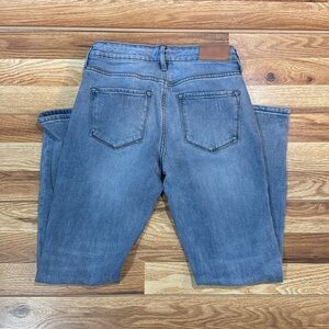 These blue jeans feature a classic light to medium wash and a straight leg design. The jeans come with a visible waistband and a convenient zipper fly for easy wear.