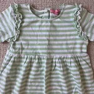 Comfortable and adorable green and white striped girls dress, Size 7. Excellent condition! Crafted from ultra-soft knit fabric, short sleeves, and playful ruffles, this dress is a must-have for any occasion. Button back closure.