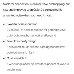 Reduce noise with Loop Quiet earplugs. Stylish and effective. Perfect for peace and quiet. Used once. All pieces intact and included in original box.