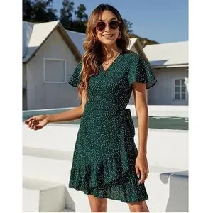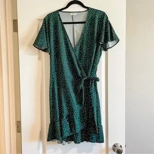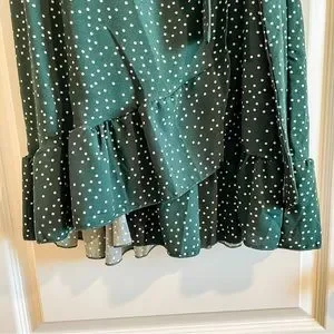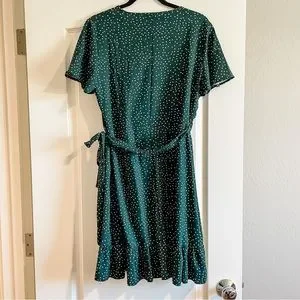 Super cute! Dark green with white polka dot print wrap dress. Ruffle details on the skirt and cap sleeves. True wrap dress ties around the waist. Has hook and eye closure for modest.