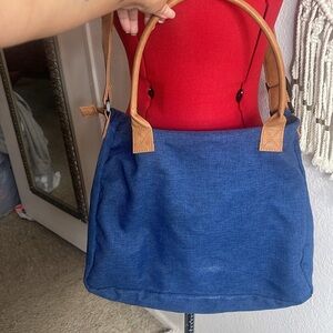 Blue Crossbody bag super stylish two front pockets, zipper closure, long strap and hand straps preowned condition but still in very good condition. Has some minor stains in th inside