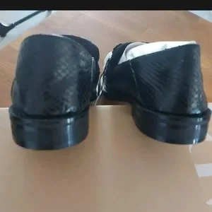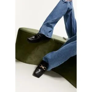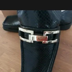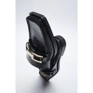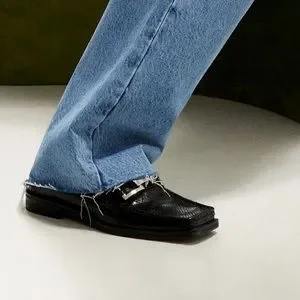 Black flat leather loafers. Animal print leather upper. Metal buckle detail on the front. Squared toe.