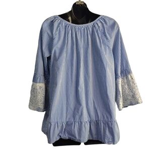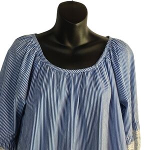 Signature Studio Women's Blue White Stripe Lace Trim Top Blouse Size L
