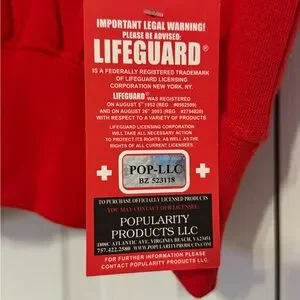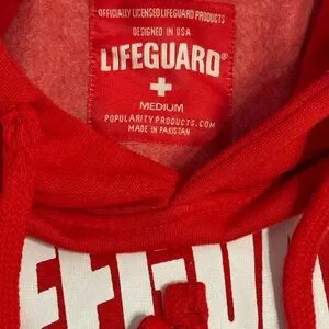 Bold red hoodie with 'Lifeguard' print. Features a front pocket and hood. Perfect for casual wear or costume!