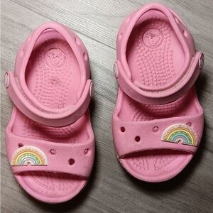 These adorable pink sandals feature a charming rainbow design, perfect for adding a splash of color to any outfit. Comfortable and stylish, they are ideal for everyday wear.