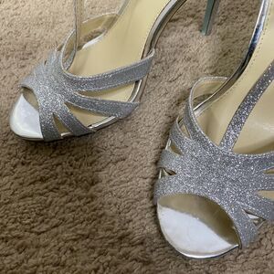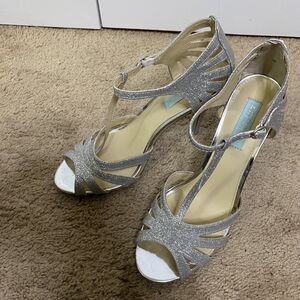 Betsey Johnson Heels Dress Silver Glitter T-Strap Peep Toe.