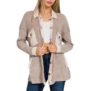 Women's Mocha Cotton Waffle Acid Wash Shacket