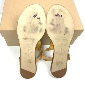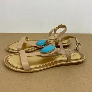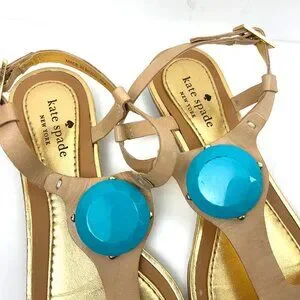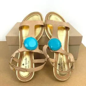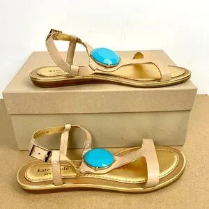 Kate Spade Leather Beige Strappy Flat Sandals with Turquoise Stone Detail Vacation Resort Party. Caramel brown and gold leather t-strap flat sandal with large blue faux stone detail and buckle around ankle strap. Made in Brazil. Good pre-owned condition, please see all photos as they are part of the description. True to size.