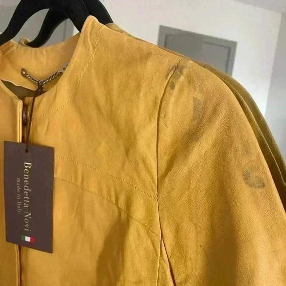 This item does have some markings on the top right shoulder shown in the picture. Elevate your wardrobe with this stunning Gold Benedetta Novi leather jacket cape in size 8. This unique piece combines the elegance of a cape with the edginess of a leather jacket, making it a versatile and stylish addition to any outfit. The luxurious gold hue adds a touch of glamour, perfect for special occasions or everyday wear. Crafted from high-quality leather, this jacket cape is not only fashionable but also durable and long-lasting. The draped silhouette and open front design create a flattering and chic look that will turn heads wherever you go. Whether you pair it with jeans and a t-shirt for a casual look or dress it up with a dress and heels, this Gold Benedetta Novi leather jacket cape is sure to make a statement. Don't miss out on this must-have piece for your wardrobe!