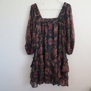 New with tags Band of the Free deep green floral mini dress with a gorgeous tiered hem design and delicate cropped balloon sleeves. Square neckline and relaxed fitting. Women's size small. Has a built in slip. Closer details as shown and measurements listed below