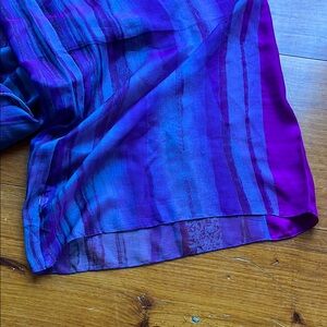 Add a touch of elegance to your outfit with this stunning purple, blue, and magenta scarf. Silky feeling fabric. Closed loop fabric on ends for elegant look around neck, gorgeous colors. Excellent used condition- no flaws seen. Brand and fabric tags cut off.