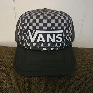 Stylish Vans trucker hat with a bold checkered pattern. Features a classic black and white design. Perfect for casual wear.