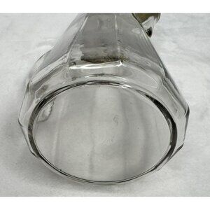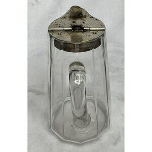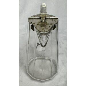 This vintage glass syrup pitcher exudes charm with its classic octagonal design. The metal hinged lid adds character and functionality, making breakfast an elegant affair. Its clear glass body allows for easy viewing of contents, while the sturdy handle ensures a comfortable grip. A timeless piece for collectors or daily use.