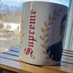 White ceramic mug with an illustration of late, great Supreme Court Justice Ruth Bader Ginsburg. Features gold leaf accents. Perfect for coffee or tea lovers.
