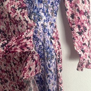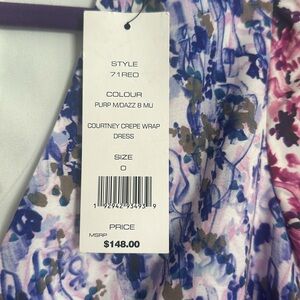 French connection Courtney crêpe wrapped dress size 0 retails $148 new with the tags beautiful spring colors fake wrap does not really have a wraparound, ruffled hem, and cuffs lined back zipper, shoulder to hand measures 34.5, under arm to under arm approximately 16 inches across, gorgeous dress