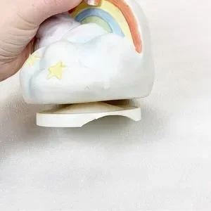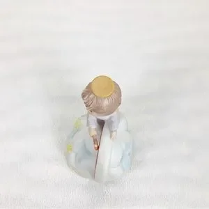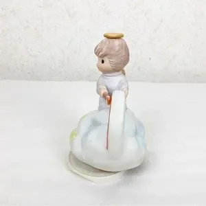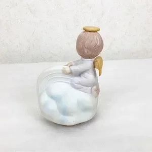 Music box with angel sitting on a cloud painting a rainbow. Plays hark the Harold angels sing