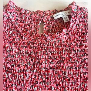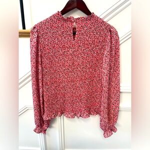 Excellent condition, like new. Elevate your style with this chic floral red smocked blouse. Perfect for any occasion, it offers a comfortable fit and a fashionable look.