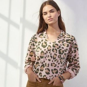 In good used condition. Leopard print. V-neck. Pullover style. Cropped length. Has a hood.