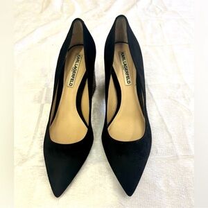 KARL LAGERFELD ADINA Black Suede Rhinestone Block Heels EUC Sz 8.5