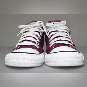 Elevate your casual look with these maroon Converse Chuck Taylor All Star Madison sneakers. The lace-up closure ensures a secure fit while the rubber outsole offers durability. Made with synthetic upper material and a cushioned tongue, these sneakers provide comfort and breathability, making them perfect for any season. Great color and condition.