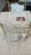 — Bed Frame: 3-piece brass bed frame. Headboard and footboard are identical but headboard is taller. Joined by a mattress supporter composed of narrow brass bars with small legs that slot into small tubes attached to headboard and footboard. This makes it easy to assemble bed and take it apart for lay-flat storage.