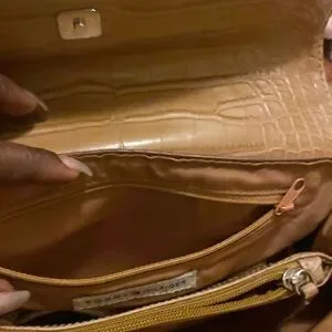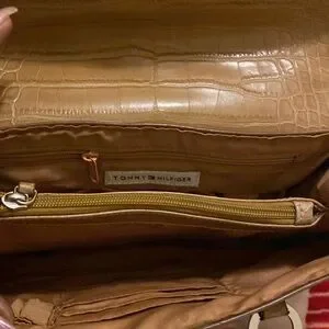 Tommy Hilfiger purse with 2 zipper opening, cards, pen holder inside. Has a slight wear on the front. Handle so a little wear not much. Still have a lot life leftr in it. Alligators hide tan color.