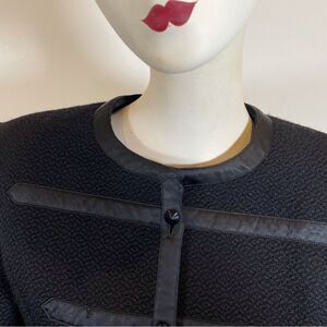Vintage black wool jacket by Guy Laroche with jewel neckline, small shoulder pads, sleeves with buttons at each cuff, black satin trim throughout with military style trim at front, tailored waistline, and button closure at front. Fabric is a lightweight wool acetate. Cropped with 3/4 length sleeve. Great condition, two small marks on front see picture. Size FR 38/US 6.
