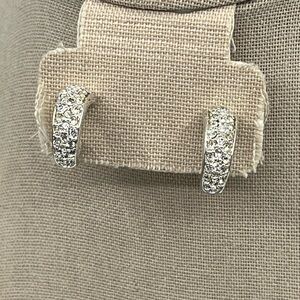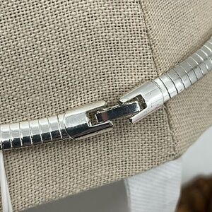 This is a beautiful matching necklace and earring set from QVC, dating back to the early 2000s. The necklace is approximately 15 to 16 inches long, perfect for a classic choker-style fit, and features a sleek silver-tone design with a sparkling crystal-accented centerpiece. The coordinating hoop earrings are also silver-tone with crystal detailing for a cohesive, elegant look.