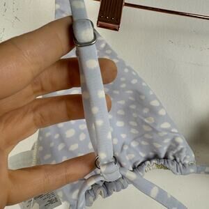Introducing the NWT Billabong Women's Tropic Jungle Colorful Palm Print Reversible Bikini Top. This versatile bikini top features a vibrant colorful palm print on one side, perfect for a tropical-inspired look. It includes adjustable straps and removable pads for customizable comfort and support. The reverse side features a blue design with white spots, offering multiple styling options for your beach or poolside adventures. Embrace both style and functionality with this chic addition to your swimwear collection.