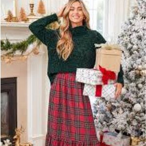Stylish red plaid skirt. Elastic waist, very comfortable. Made from a cotton-polyester blend. Only worn once or twice.
