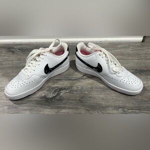 These Nike Women’s sneakers feature a stylish white design with a bold black swoosh and hyperpink detail. Perfect for everyday wear, they offer comfort and style. NEVER WORN. NO original box.