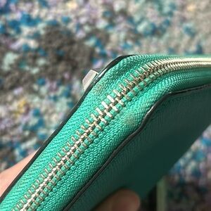 Great color! Does the zipper(s) work easily? What is pic 5 showing? is it glued or coming apart? The rest of the wallet looks great. :)