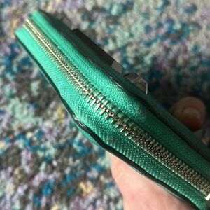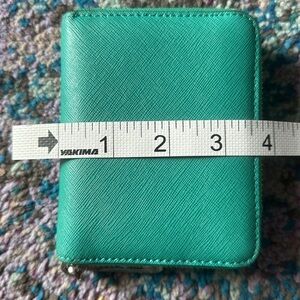 Chic and stylish, this Rebecca Minkoff leather wallet in teal is perfect for organizing your essentials. Its sleek design and vibrant color make it a standout accessory.