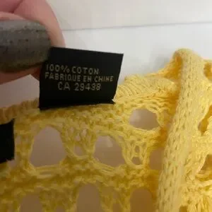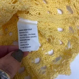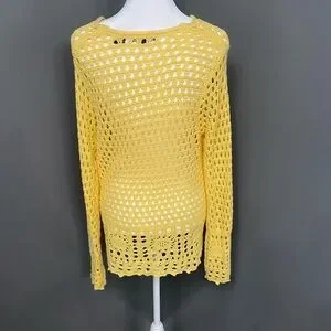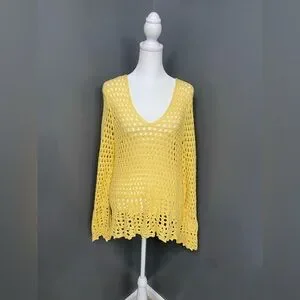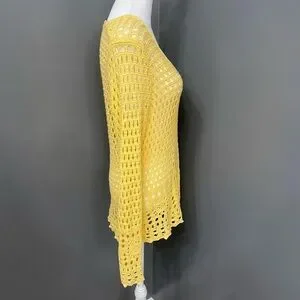 A bohemian-inspired Jeanne Pierre women's sweater in a sunny yellow hue with long sleeves and an open-knit crochet design. This boho, beach, hippie style top features a boat neck /V neck, perfect for travel or casual wear in summer, fall, or spring. Made from 100% cotton, this pullover has a regular fit and requires hand wash care. Ideal for those seeking a relaxed, free-spirited style.