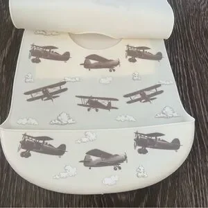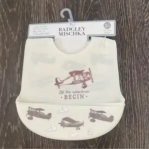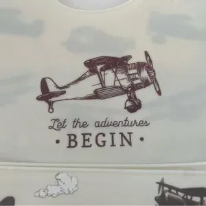 New! Badgley Mischka Vintage "Let the adventures Begin" Silicone Bib Set. Adorable vintage airplane print. 2 Piece set.