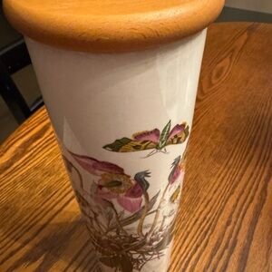 This "Christmas Rose" canister is a vintage ceramic and porcelain piece from Portmeirion, standing at 11 inches tall. It features a multicolor garden theme and comes with a lid. It is an original item, not an antique or reproduction.