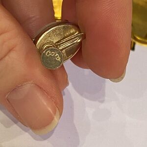 Gold tone, with light pink and white on front. I estimate these to e from around 1940. These are Coro” brand.