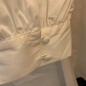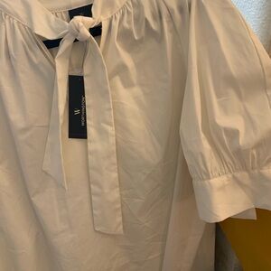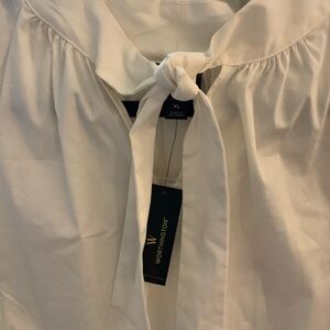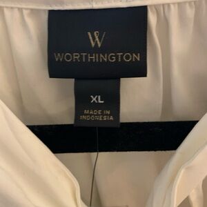 NWT’s, Worthington's Elegant white cotton blend peasant-styled short-sleeved Blouse. It has a stylish adjustable tie collar, cap short sleeves with bell style, and waist accenting darts in the body, with button accents on the sleeve. Very stylish and functional, perfect for any occasion dress it up for work or casual outings.