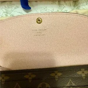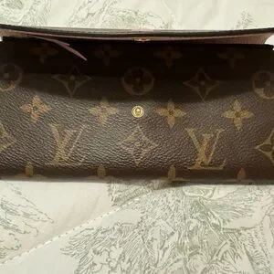 This authentic Louis Vuitton Emilie Wallet is in excellent, pre-owned condition and was barely used. Comes with original dust bag, box and ribbon. Wallet has 4 credit card slots, 1 zipped coin pocket, 2 inside flat pockets, 1 large gusseted compartment and press stud closing. Made in France.