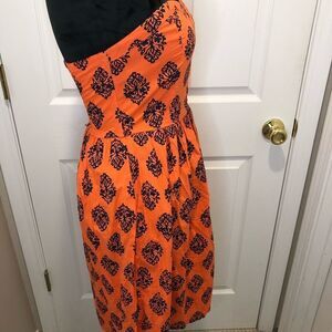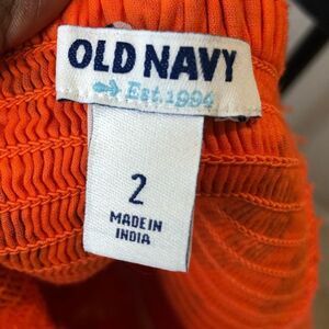 Old Navy strapless midi dress, orange with blue designs throughout. Elastic in back and zips on the side. Zipper sticks a bit but still works. Size 2, pit to pit 14in, length 30in. Small hole in front from the tag. 🌸🌸