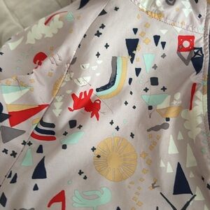I believe this is a size 2T, though the tag has been removed because my kids liked to wear it on either side. In the last two pictures, the jacket is laid upon a gap 2T raincoat, and more or less it’s the same size, albeit with slightly longer sleeves.