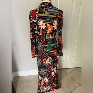 Maxi length with extra ruffle fabric in front that gives illusion of awrap dress