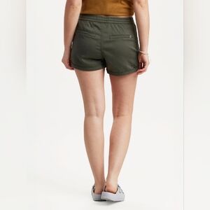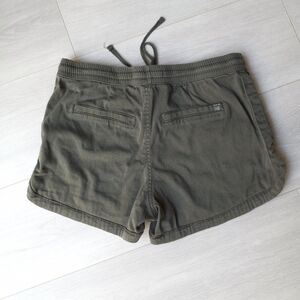 UnionBay Maribeth Sateen Pull-on Cargo Shorts, Juniors Size M. Fatigue Green color. Elasticized waistband with drawstring. Side dolphin hems. Drawstring intact and functional. Two exterior pockets and two rear pockets. Minor wear including fading and piling throughout. No rips, holes, or stains. Overall good preowned condition.