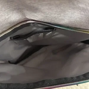 Pretty rainbow zipper on bottom pocket. Rose Gold accessories.