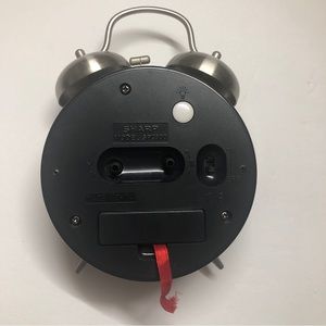 The clock needs a AA battery to work again. White button on the back is a flashlight to see the clock’s time in the dark. The red hand on the clock is to set the alarm.