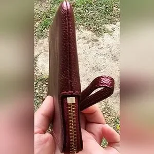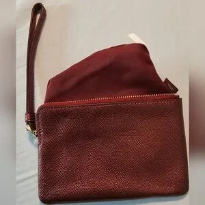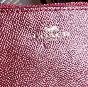 Coach Metallic Cherry Leather wristlet new without tags, in new condition no wear or callouts. Measures 6 inches by 4 inches with zipper closure 6 inch strap, two inside credit card slots. Ships from smoke-free and pet free home.