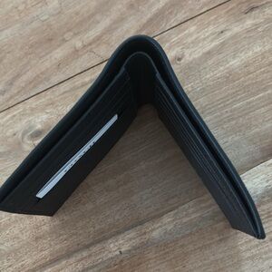 This Coach key and card holder features a sleek black leather design with a textured surface. Its compact size makes it perfect for carrying essentials while maintaining a stylish appearance.