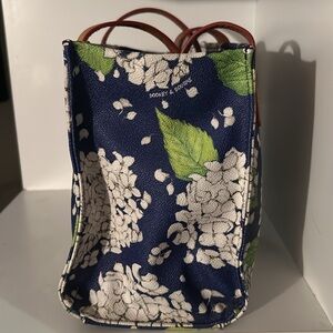 Great spring / summer hand bag. Beautiful Hydrangea print. Bag has Red lining and is is excellent condition. Little wear in lining. See pics. Has attacked latch for keys one zipper pocket and one non zipper pocket.