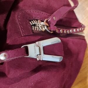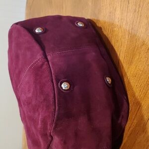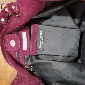 Gorgeous purple suede handbag by Via Repubblica. Made in Italy of nice quality suede with silver hardware. Bag is near perfect. Only flaw is on the leather string pull attached to the front zippers. it's coming apart in the middle. Otherwise bag looks perfect.