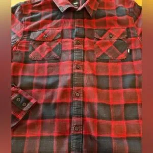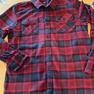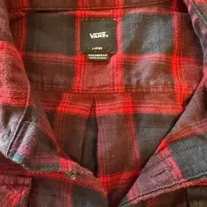 Red and blue plaid button up shirt from Vans. Men’s sizer large measures armpit to armpit 22” neck to shoulder 6” shoulder to wrist 25” back of neck to bottom hem 31”